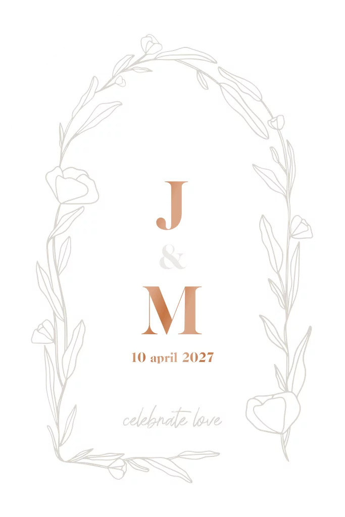 Deze mooie trouwkaart is uniek door zijn uitgesneden vorm. Op de minimalistische rustige kaart met afgeronde bovenkant is gebruik gemaakt van mooie lijntekeningen. Op de voorkant van de kaart staan de initialen van het bruidspaar. In de stijl van deze trouwkaart zijn nog veel meer producten te vinden! Je kunt zo al je trouwdrukwerk bij elkaar laten passen, denk bijvoorbeeld aan een save the date, sluitsticker, welkomstbord en bedankje in dezelfde stijl.