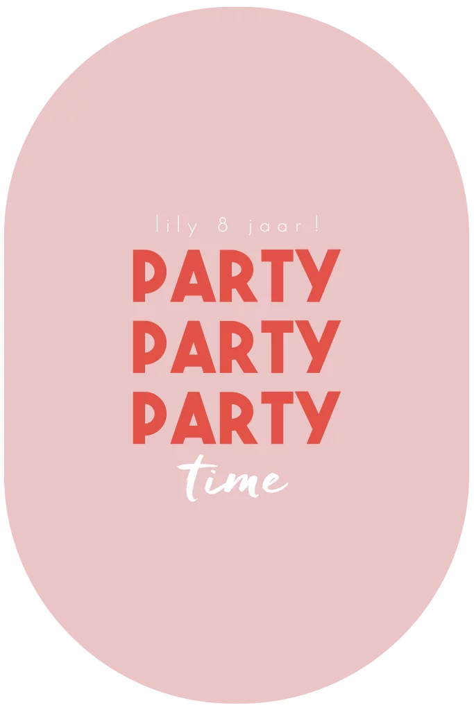 Vrolijke uitnodiging voor het vieren van een kinderfeestje. De kaart is in een bijzondere afgeronde vorm uitgesneden en heeft de tekst: Party Party Party time’.