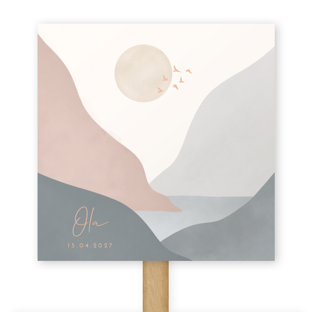 Tuinbord met bergen van bijpassend geboortekaartje voor meisjes