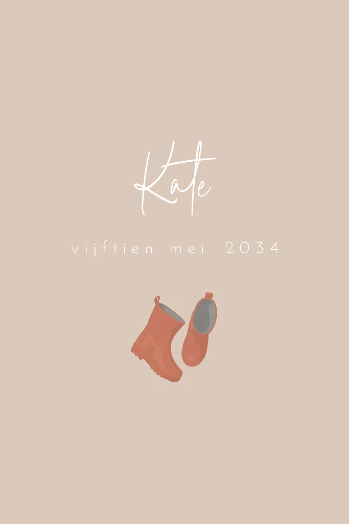 Een lief geboortekaartje voor een meisje met regenlaarsjes en de naam in goudfolie. Echt een kaartje voor een voorjaar of zomer meisje.