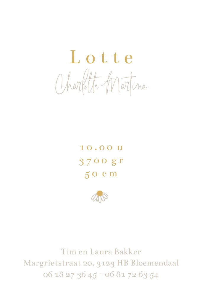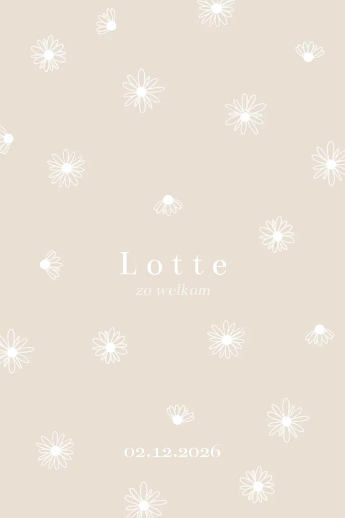Lief minimalistisch geboortekaartje in natuurtinten voor een meisje. Op het kaartje staan schattige madeliefjes met een hartje van goud.