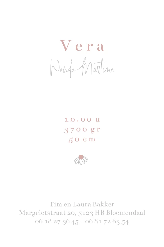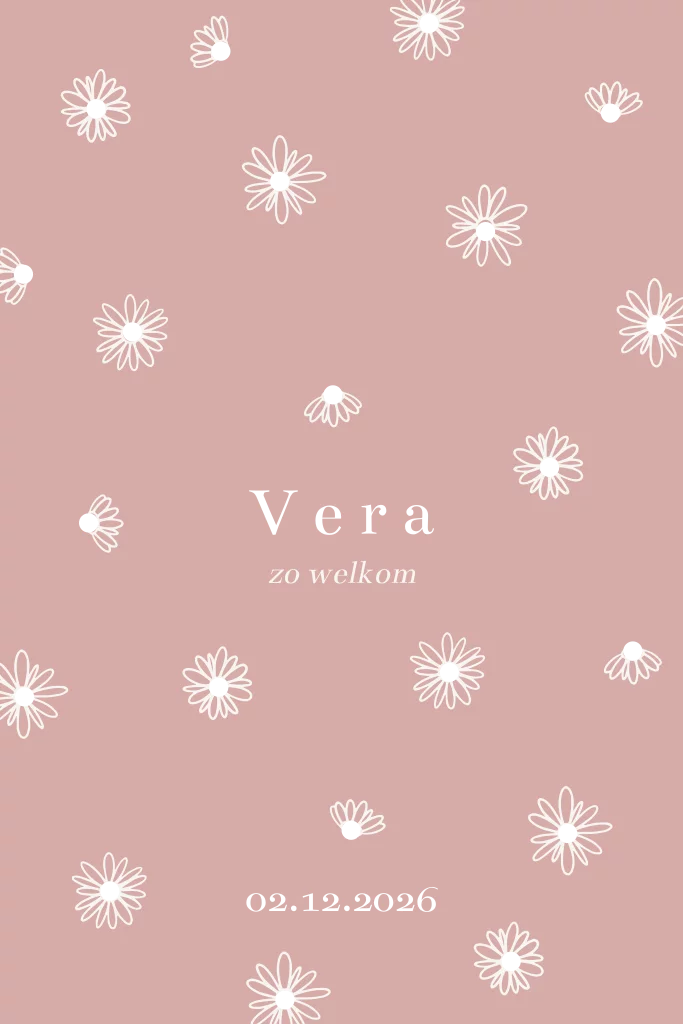 Lief minimalistisch geboortekaartje in roze tinten voor een meisje. Op het kaartje staan schattige madeliefjes met een hartje van holografisch folie, wat het kaartje een romantische en klassieke uitstraling geeft. Dit geboortekaartje is perfect voor ouders die op zoek zijn naar een lief en bloemig kaartje.