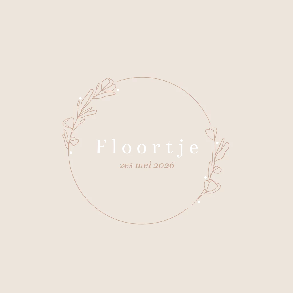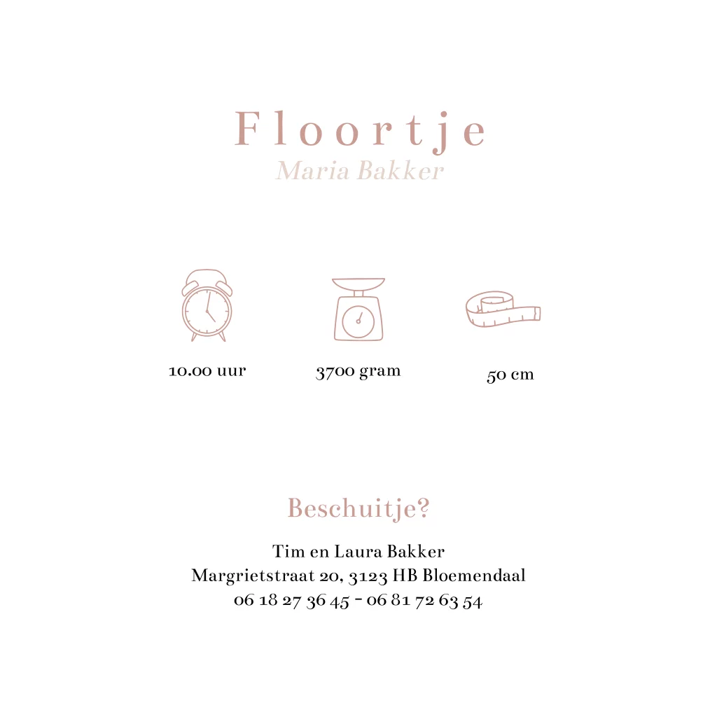 Minimalistisch geboortekaartje met bloemetjes en stipjes van roségoud