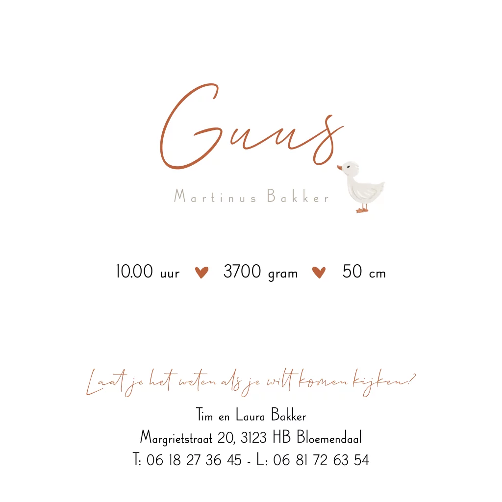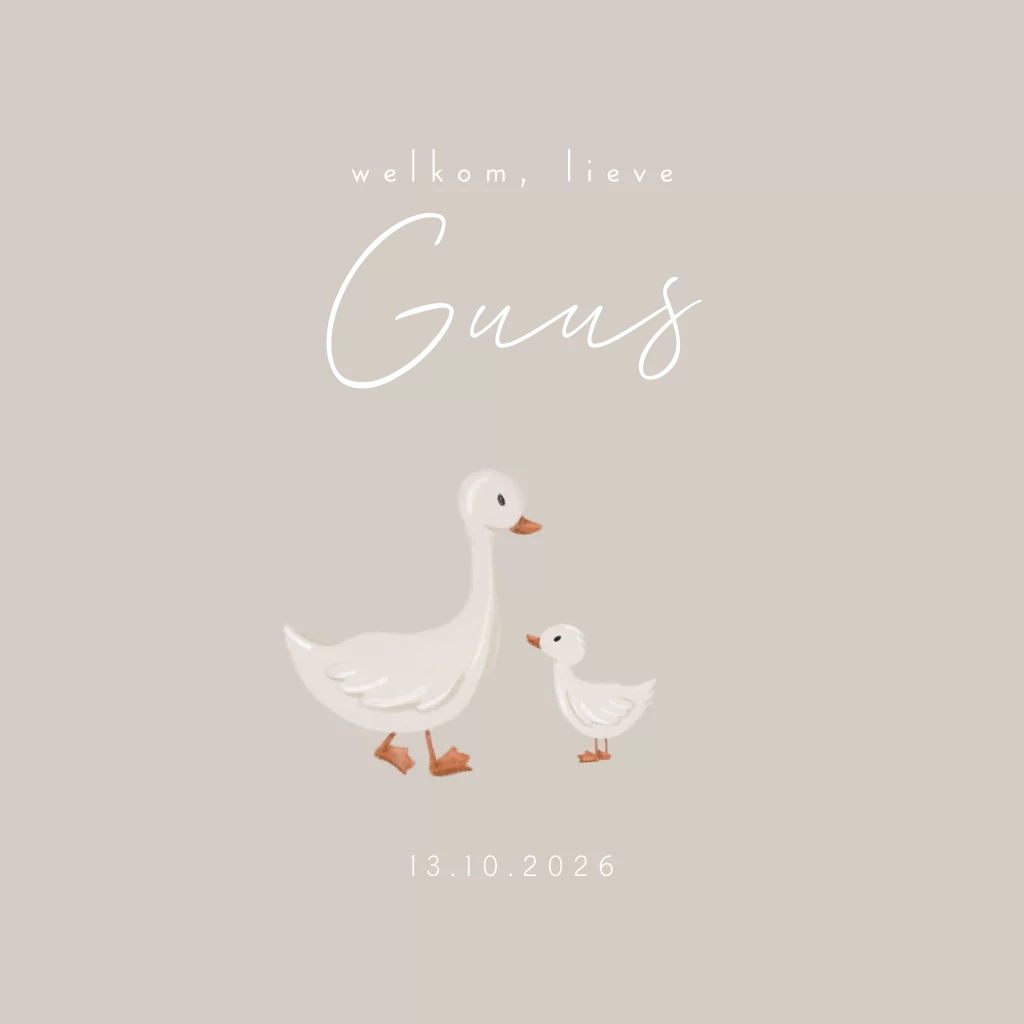 Een schattig geboortekaartje dat perfect past bij de geboorte van jullie kindje. Met een minimalistisch en illustratief design straalt dit kaartje rust en liefde uit. De naam gedrukt in goudfolie zorgt voor een luxe uitstraling. Of jullie nu een zoon of dochter verwachten, je kunt dit kaartje zowel gebruiken voor een jongen of een meisje. De warme kleuren beige en bruin geven het kaartje een rustige en natuurlijke uitstraling, perfect passend bij de lente. De foliedruk details zorgen voor een extra vleugje elegantie. Je kunt zelf in de editor extra diertjes toevoegen zodat het kaartje een afspiegeling is van jullie gezin.