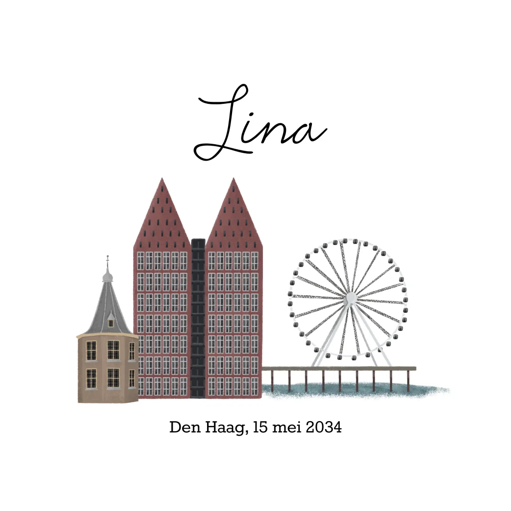 Een uniek geboortekaartje voor de echte Hagenees! De gebouwen en het reuzenrad maken dit echt een Haags geboortekaartje