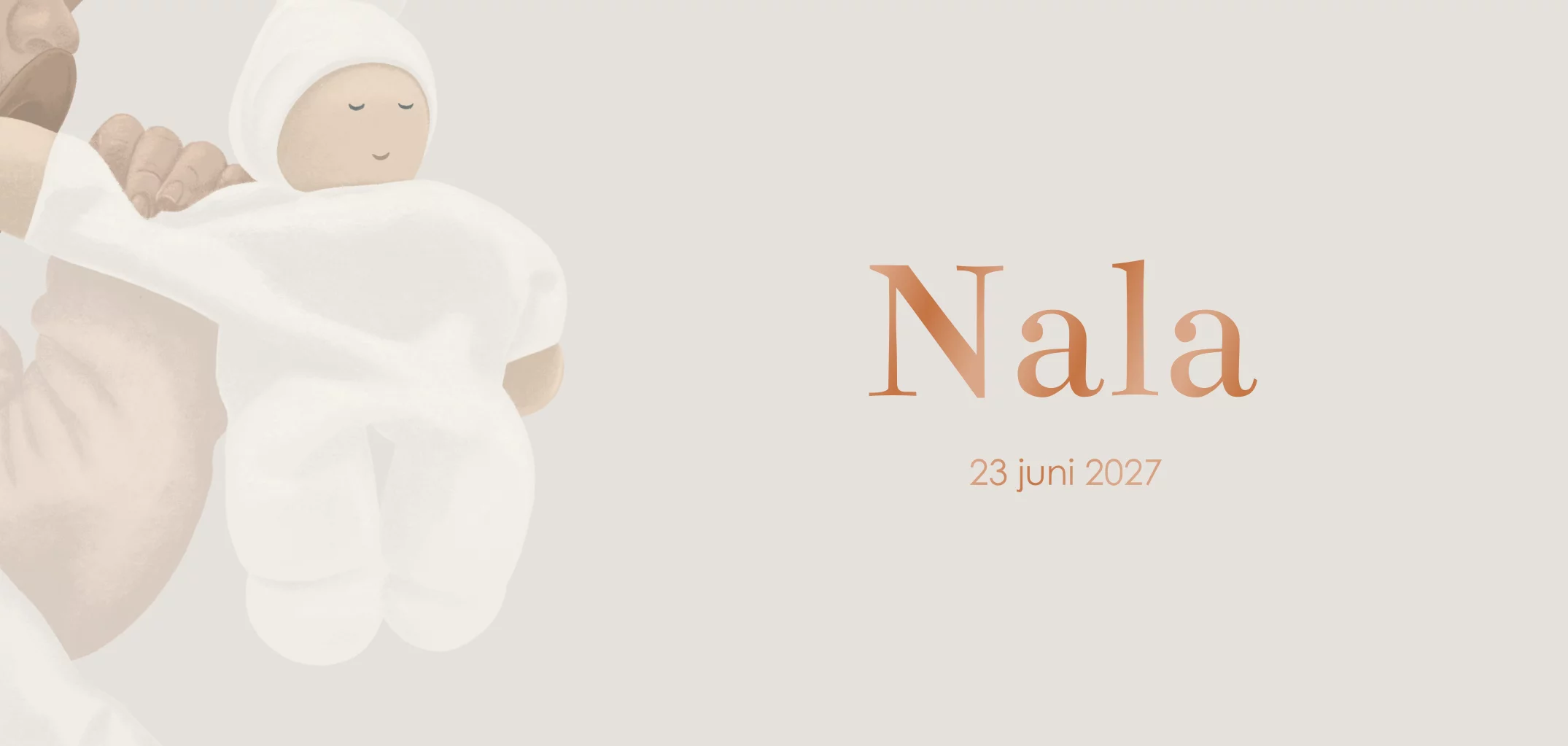 Lief geboortekaartje voor een meisje. Op het kaartje staat een illustratie van een babyhandje dat een knuffel pop vasthoudt. Er is gebruik gemaakt van roestkleurig hoogglansfolie. Nala