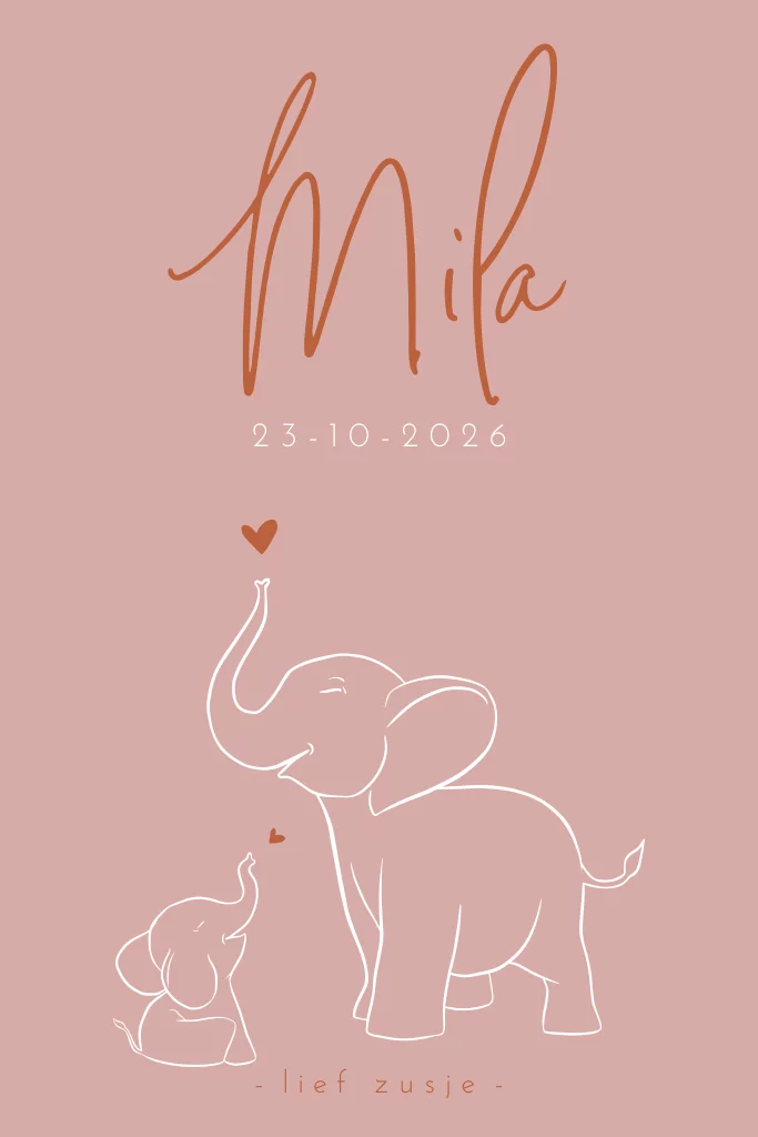 Schattig hip roze geboortekaartje met terra-kleurige tekst en hartjes. De illustratie van de olifantjes is wit, maar kun je zelf elke kleur geven die je maar wilt.