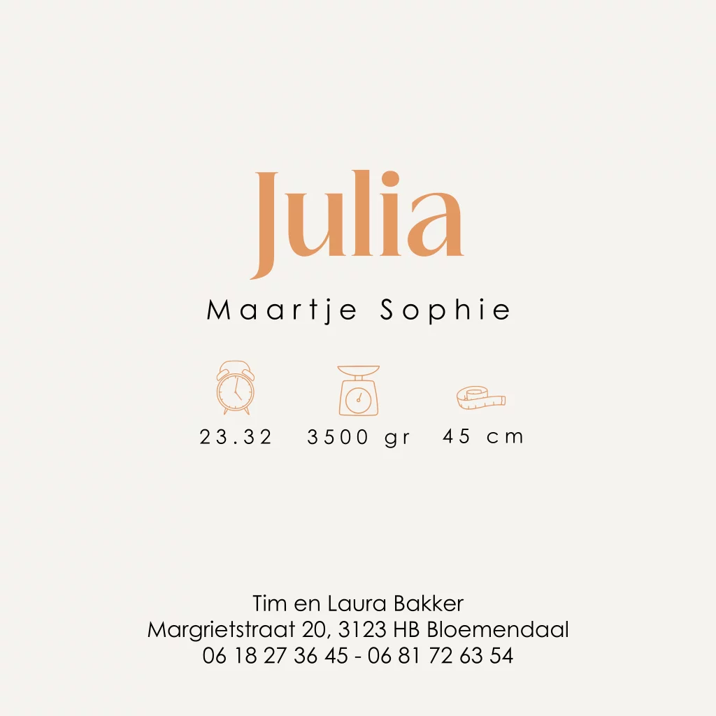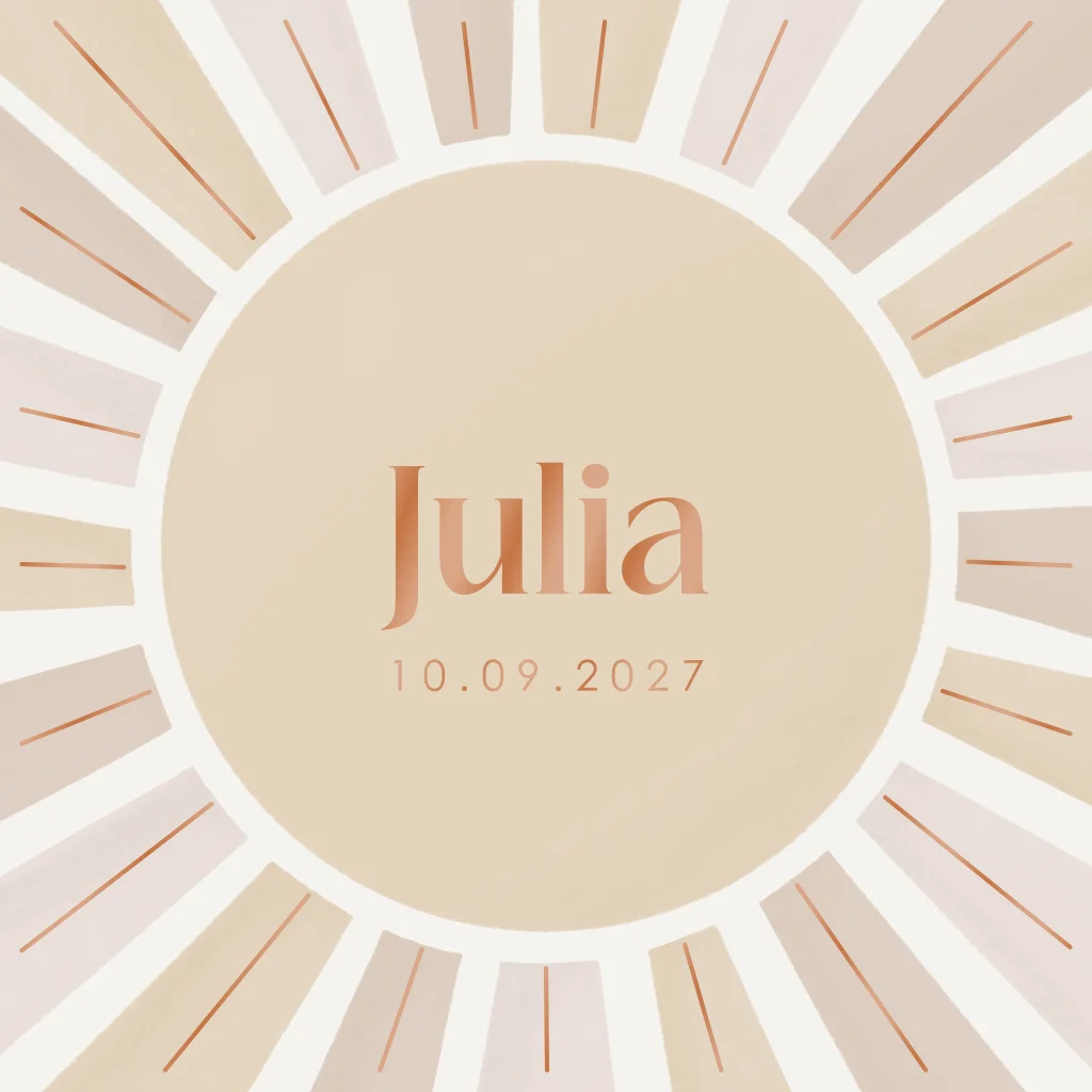 Lief geboortekaartje voor een meisje. Op het geboortekaartje staat een afbeelding van de zon, met daaroverheen zonnestralen.