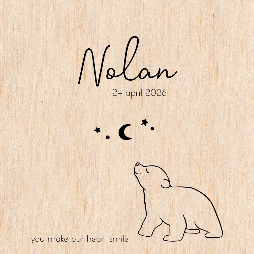 Een lief geboortekaartje op 1 mm dik echt hout gedrukt. Helemaal trendy met de ronde hoeken, het maantje en de sterretjes en het beertje. Je kunt eventueel zelf de illustraties wijzigen door andere illustraties in de beeldbank.
