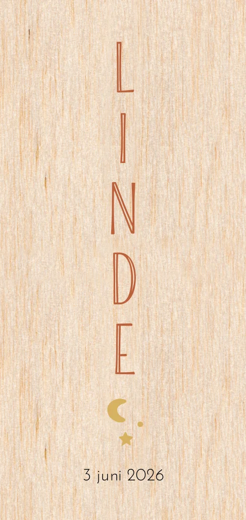 Een mooi minimalistisch geboortekaartje met een klein maantje en sterretje op 1 mm dik echt hout.