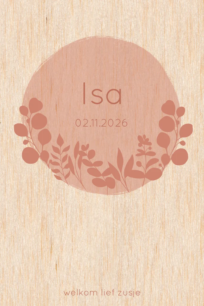 Een ontzettend mooi geboortekaartje voor een meisje. Het heeft een unieke, rustieke en chique uitstraling door de kleurencombinatie, de takjes en het hout.