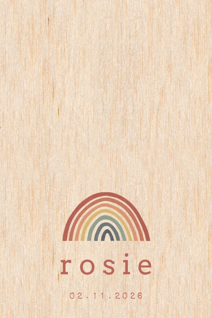 Een trendy en rustiek geboortekaartje met een regenboog op 1 mm dik echt hout.