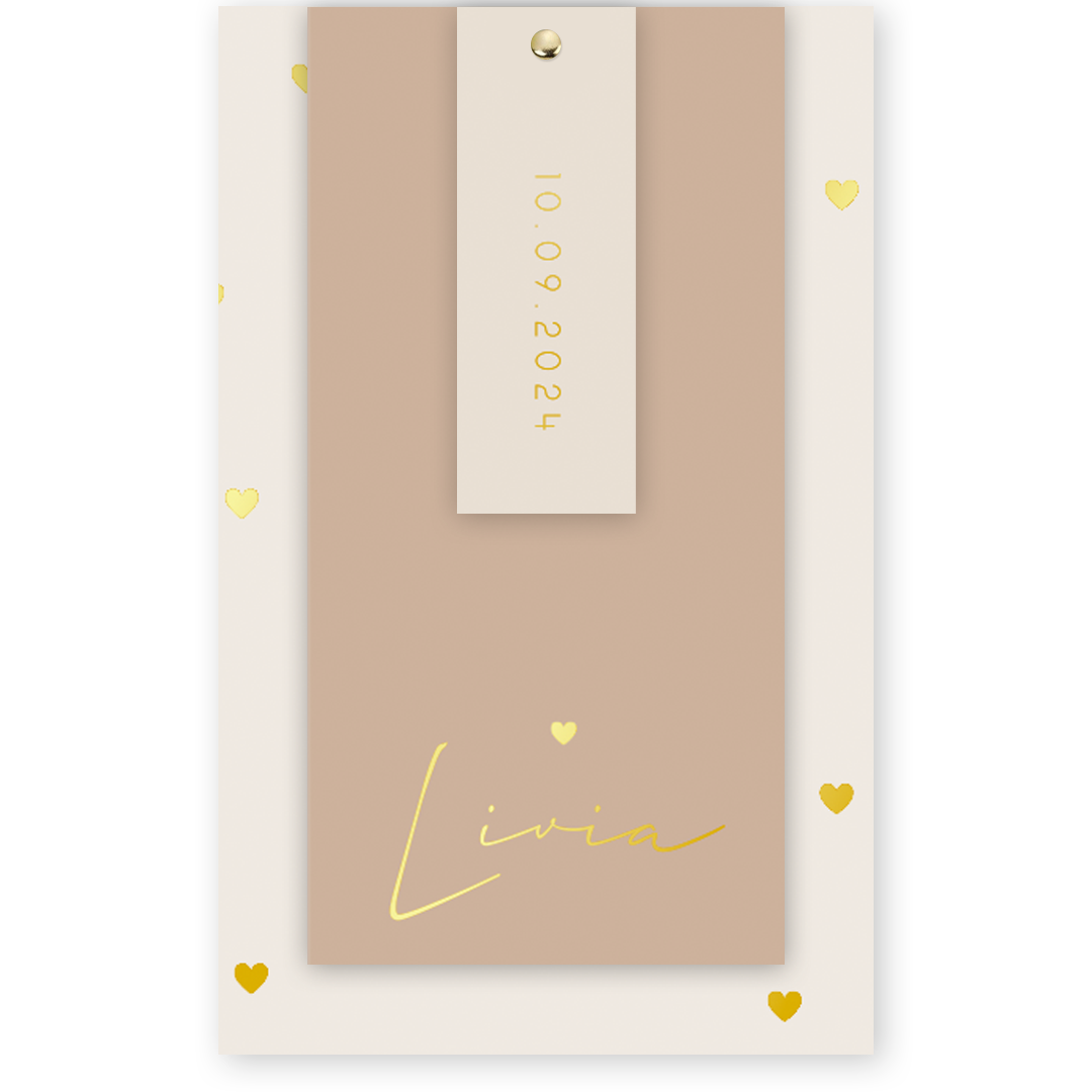 Geboortekaartje labelkaart met losse kaartjes en goudfolie hartjes