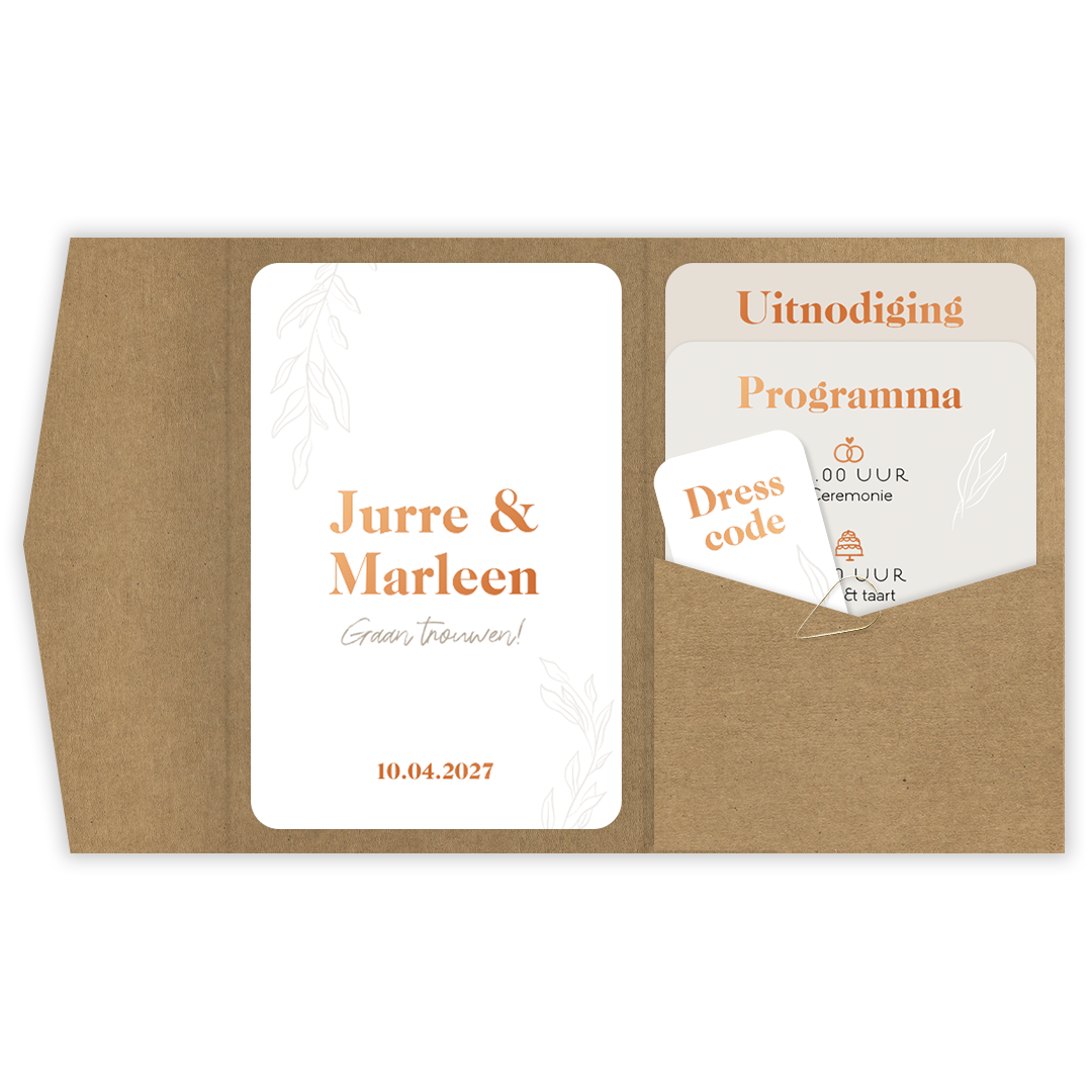 Wil jij een mooie minimalistische uitnodiging voor jullie trouwdag met 4 losse kaartjes? Dan is dit ontwerp voor jou. Deze vier kaartjes zijn zo op maat gesneden dat ze precies in een rechthoekige pocketfold passen. De kaart met de namen en datum plak je vast op de pocketfold en de andere kaartjes met het programma, de dresscode en de uitnodiging kun je achter elkaar in het steekvakje steken. Op de kaart met minimalistisch botanisch thema is gebruik gemaakt van rustige zandkleuren. Let op: de pocketfold moet je los bij de uitnodiging bestellen en is niet inbegrepen bij de kaart.