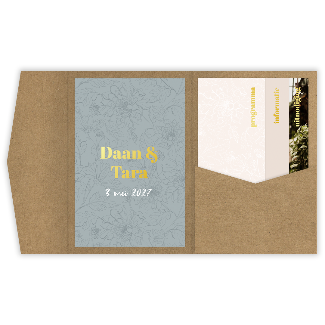 Ontdek een nieuwe deze pocketfold trouwkaart, met een mooie mix van klassieke bloemen en goudfolie. Deze prachtige set bestaat uit drie losse kaarten, elk met een betoverende mix van blauwtinten en zandkleur, geaccentueerd door sprankelende teksten in goudfolie. Een elegant bloemenpatroon voegt een romantische sfeer toe aan deze visuele meesterwerk.