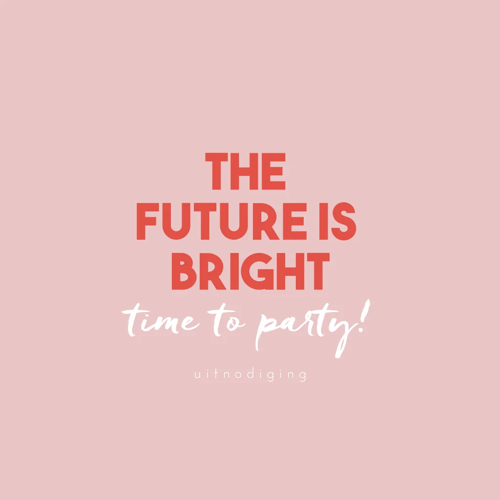 Een leuke kaart om je vrienden uit te nodigen voor je examenfeest. De tekst op de kaart is ‘the future is bright, time to party!’.
