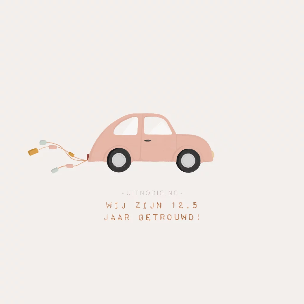 Een leuke hippe uitnodiging voor een jubileumfeest ter gelegenheid van een 12,5 jarig huwelijk. Op de voorkant vind je een illustratie van een leuke ‘just married’ auto en tekst.