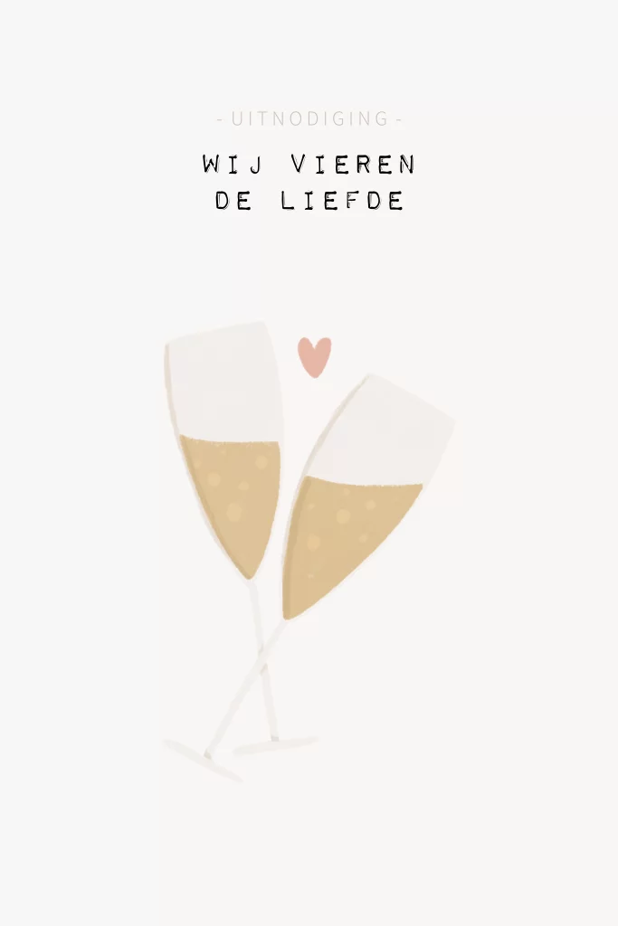 Vrolijke en hippe uitnodiging om de liefde te vieren! Op de uitnodiging staat een illustratie van twee champagneglaen met de tekst ‘Wij vieren de liefde’. Deze kaart kan voor allerlei jubilea gebruikt worden.