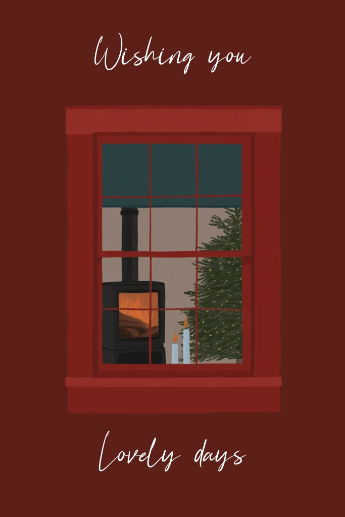 Kerstkaart met illustratie van een raam met daarachter een gezellig kersttafereeltje. Alle teksten en kleuren zijn zelf aan te passen in onze editor.