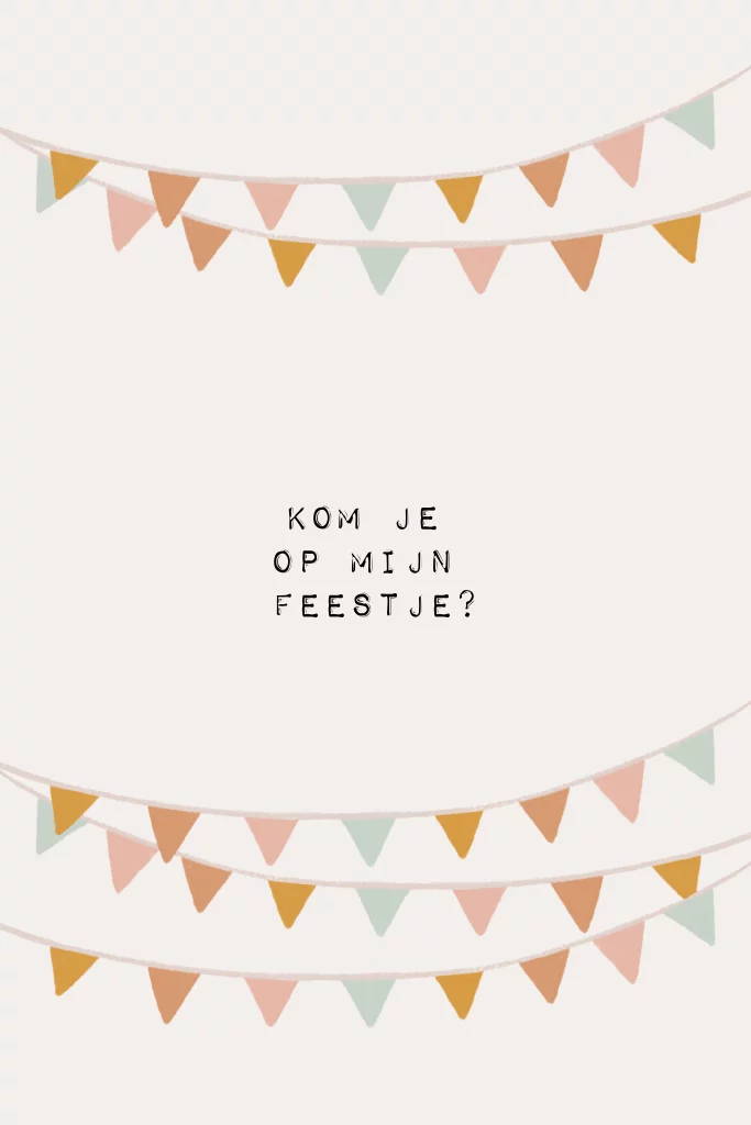 Leuke hippe uitnodiging voor een kinderfeestje met vrolijke tekeningen van slingers en de tekst: ‘kom je op mijn feestje?’.