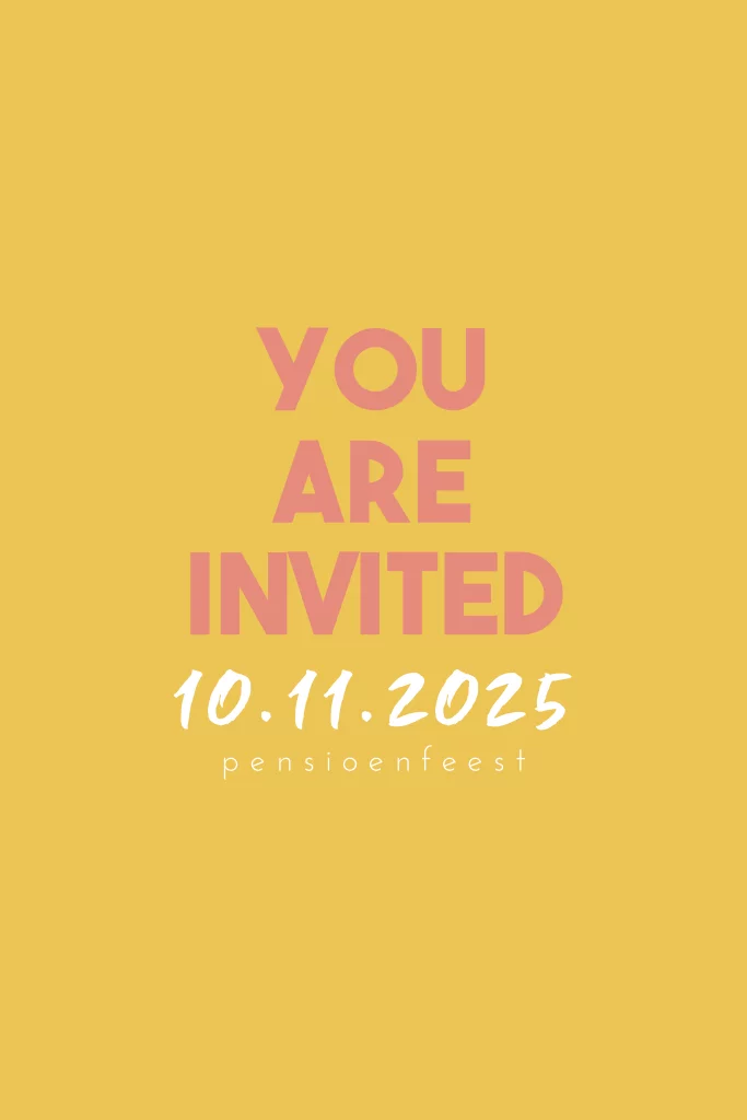 Vrolijke kleurrijke uitnodiging voor een pensioenfeest met de tekst: ‘You are invited’.