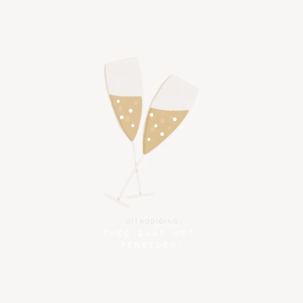 Ga je met pensioen? Dan is deze chique uitnodiging voor jou! Op de voorkant van de kaart is gebruik gemaakt van goudfolie in de tekst en kleine bubbels van de champagne zijn ook van goudfolie.