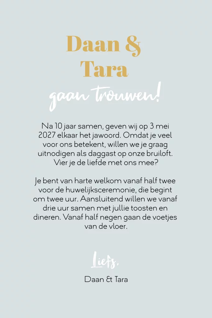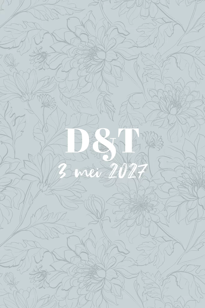 Verras je geliefden met onze prachtige botanische bloemige trouwkaart. Een harmonieus samenspel van rustige blauwe tinten en glinsterend goudfolie creëert een uitnodiging die subtiel in het oog springt. Met een subliem patroon van bloemen geaccentueerd door de gouden glans van de tekst, straalt deze kaart verfijning en stijl uit.