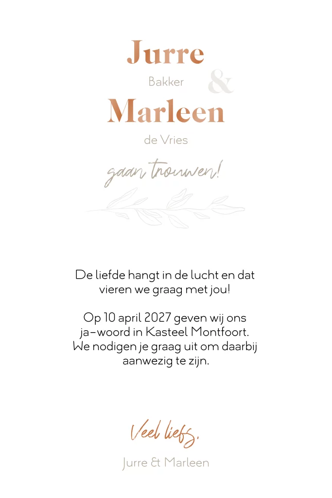Onze aanpasbare trouwkaarten geven je de vrijheid om de tekst, lettertypen en kleuren aan te passen, zodat je trouwuitnodiging volledig aansluit bij jullie persoonlijke smaak en thema. Of je nu kiest voor een modern, klassiek, boho of romantisch thema, onze ontwerpen passen perfect bij elke bruiloftsstijl. Daarnaast kun je ook belangrijke informatie toevoegen, zoals de datum, locatie, dresscode en RSVP-details, om ervoor te zorgen dat je gasten alle nodige informatie hebben.