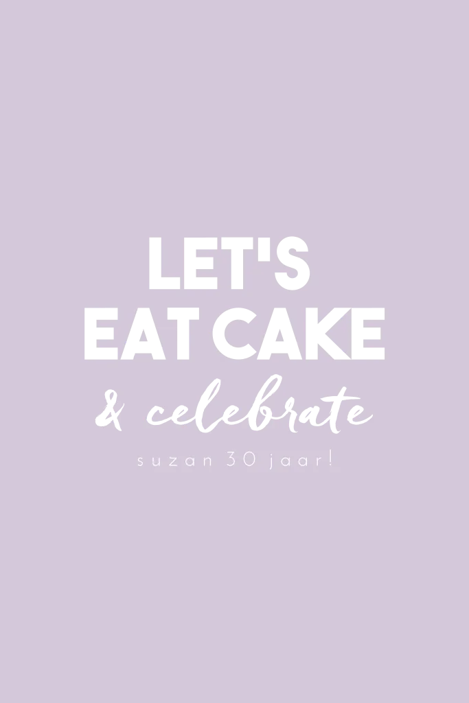 Een vrolijk paars gekleurde uitnodiging met holografische regenboogkleurige letters. Op deze uitnodiging voor een verjaardag of ander feest staat de tekst: ‘Let’s eat cake & celebrate’.