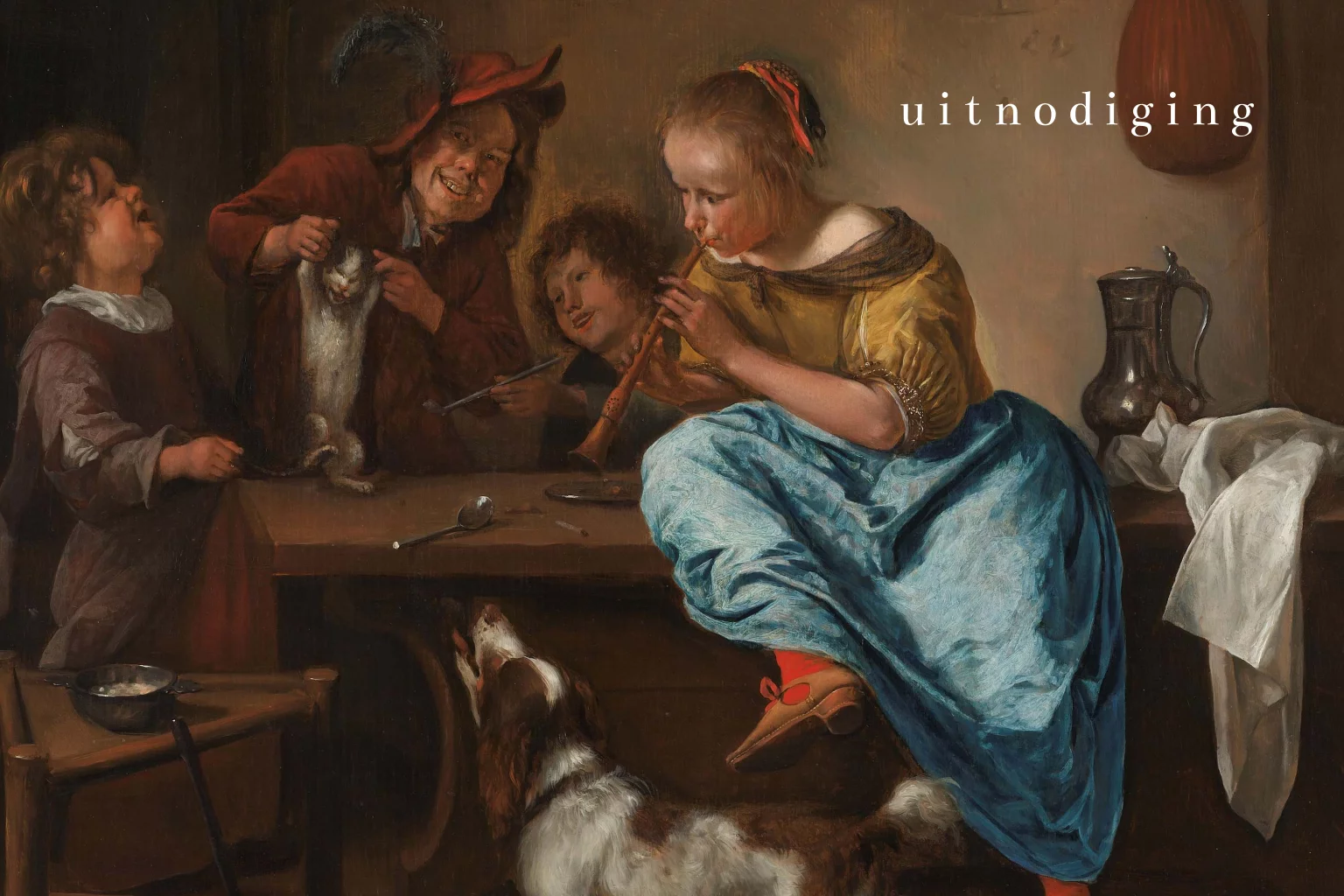 Een vrolijke uitnodiging voor een verjaardag, jubileum of ander feest. Op de voorkant van het kaartje staat een schilderij van Jan Steen.