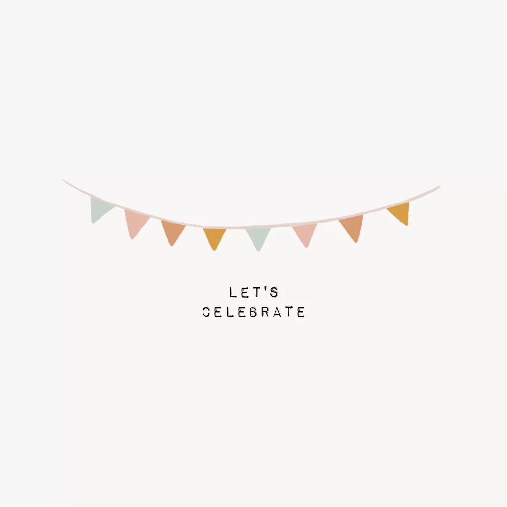 Vrolijke eenvoudige uitnodiging voor het vieren van je verjaardag. Op de voorkant van de kaart vind je een illustratie van een vlaggenlijn en de tekst ‘Let’s celebrate’.