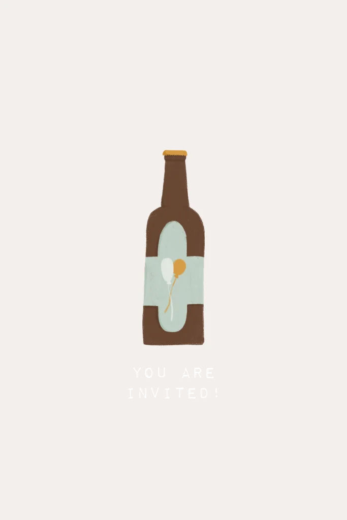 Leuke stoere uitnodiging met illustratie van bierflesje voor een verjaardag. Op de voorkant van de kaart wordt gebruik gemaakt van goudfolie en is de tekst ‘you are invited’ te lezen.