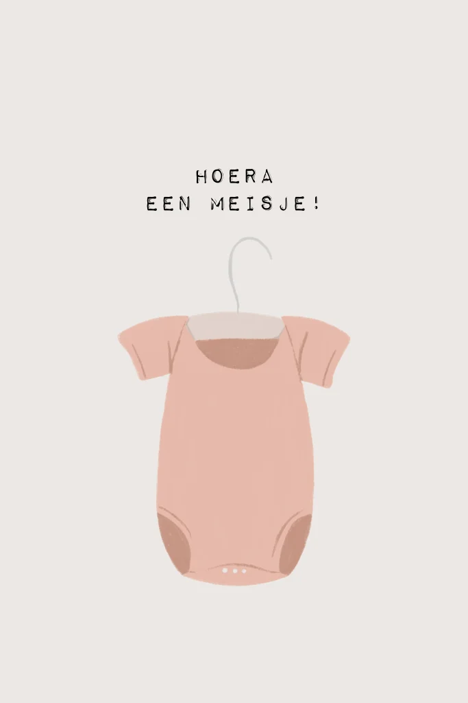 Lieve vrolijke hippe wenskaart om te sturen naar kersverse ouders van een meisje. Op de kaart vind je een illustratie van een roze rompertje aan een kledinghanger en de tekst: 'Hoera een meisje!'.