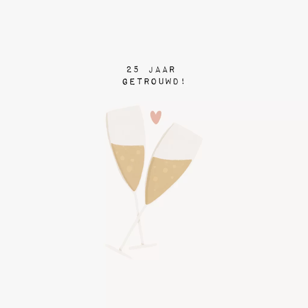 Schattige hippe wenskaart om een getrouwd stel te feliciteren met 25 jaar huwelijk, een zilveren huwelijk. Op de kaart staan twee champagneglazen met een hartje.