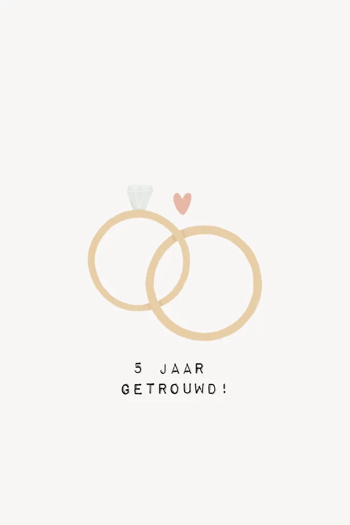 Vrolijke hippe wenskaart om een stel dat vijf jaar getrouwd is en hun houten huwelijk viert, te feliciteren. Op de kaart staat een illustratie van twee ringen en de tekst: '5 jaar getrouwd!'.