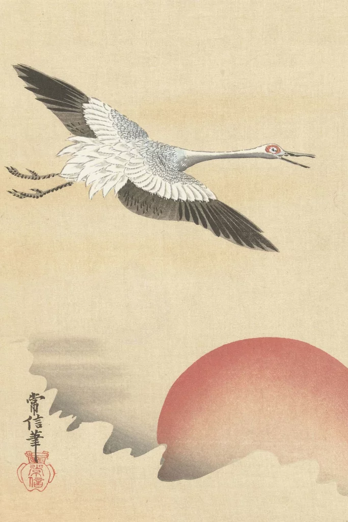 Uit de collectie van het Rijksmuseum: Kraanvogel vliegend bij rode maan, Kano Tsunenobu, 1893