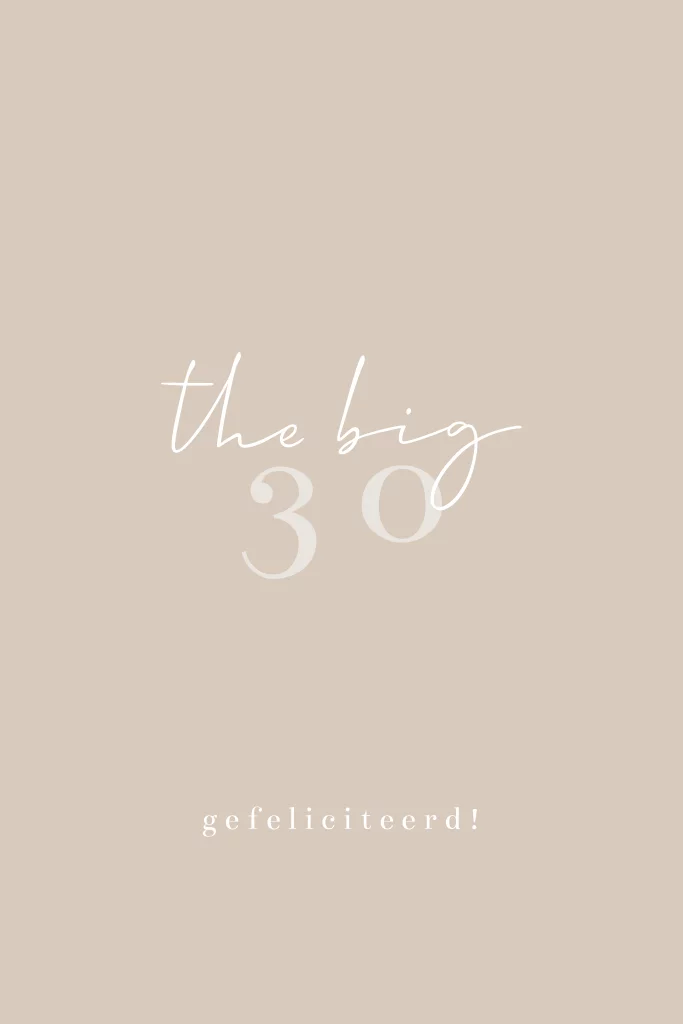 Mooie zandkleurige staande wenskaart om een jarige te feliciteren die 30 jaar oud wordt. De tekst op de kaart is 'The big 3 0 - gefeliciteerd!'