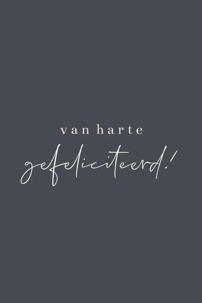 Een rustige minimalistische donkerblauwe staande wenskaart voor een verjaardag of andere feestelijke gelegenheid met de tekst 'van harte gefeliciteerd!'.