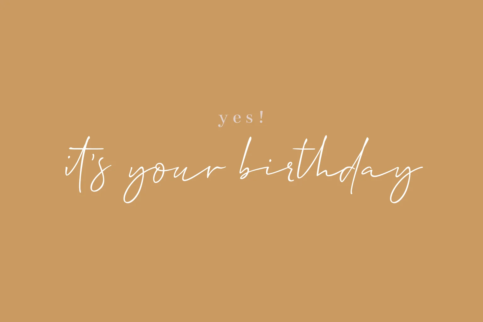 Vrolijke gele liggende wenskaart voor een jarige met de tekst 'yes! It's your birthday'.